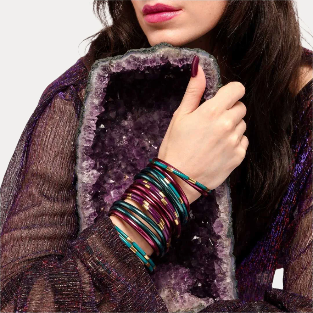 Inspired by the inky shades of night mixed with exotic shades of orchids in a tropical paradise, BuDhaGirl Amethyst All Weather Bangles® (AWB®), are the epitome of luxury in BuDhaGirl's impressive lifestyle collection. Our remarkable bangles redefine elegance with their weightless, soundless, waterproof, and TSA-proof design. Crafted to perfection, each set comprises six bangles, symbolizing intentions for the day. Wear them anywhere, as their soundless and waterproof nature ensures seamless integration into any setting.