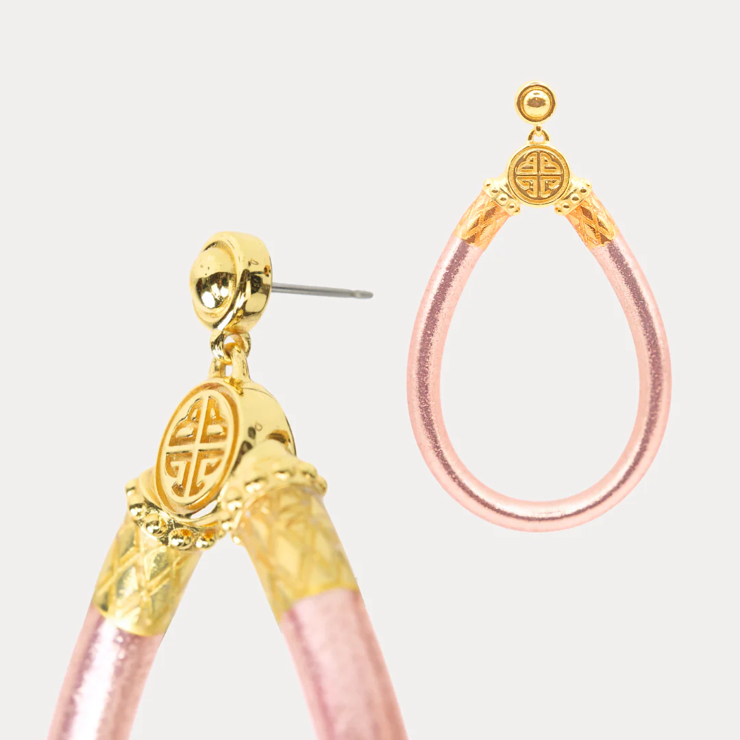 Sculpted in a timeless teardrop silhouette and available in radiant shades, these Champagne All Weather Earrings are weightless, soundless, and waterproofâmade to move with you from morning meditation to evening celebrations. A luminous gold-plated logo bead crowns each piece, echoing the signature finish of our beloved bangles.