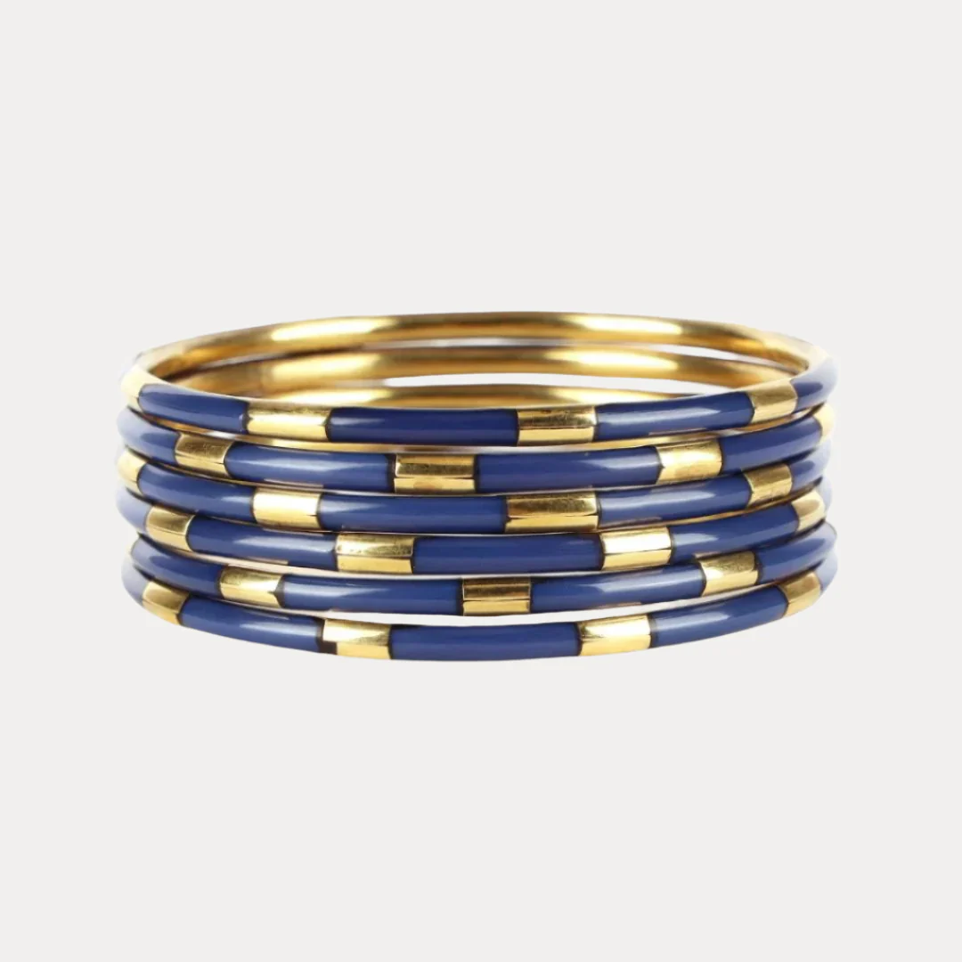 BuDhaGirl's Veda enamel and brass bangles have become a beloved choice for mixing and matching! Navy is a color that exudes sophistication and style. Vedas are meticulously crafted bangles that feature exquisite enamel work in stunning colors, designed to complement our AWB® and enhance your wristscape. With their slim profile and feather-light feel, these six beautiful bangles are a joy to wear because they are so very combinable