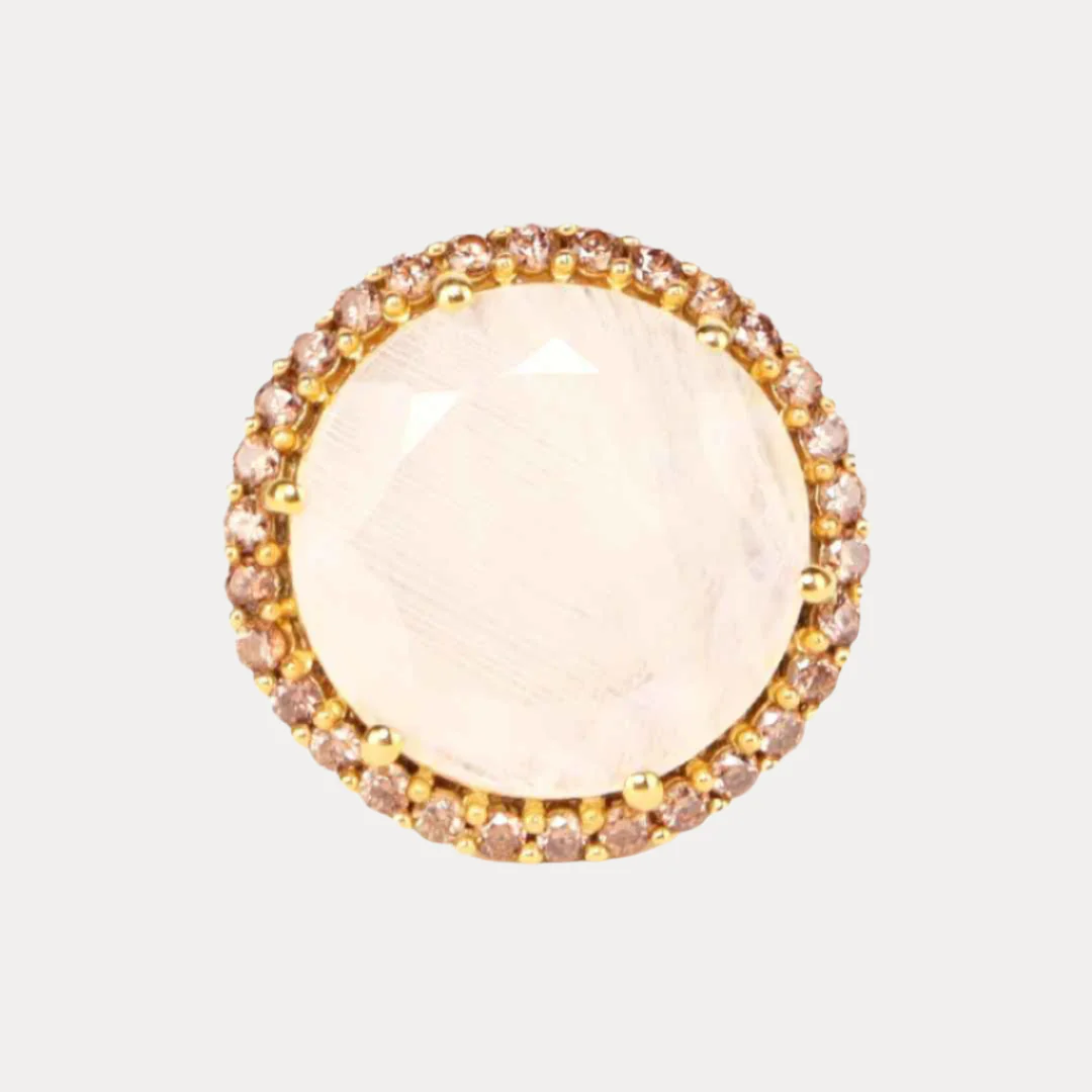 A central faceted crystal cabochon orb is surrounded by gemstones to create our out-of-this-world Nebula ring. Choose between our subtle combinations of Citrine with Amethyst, Pink with Green, or Rainbow Moonstone with Pink. Be daring and stack two or maybe even three Nebula rings to create your very own stellar statement. Nebula rings are gold-plated brass and are one size fits most as they are adjustable. Handcrafted in India exclusively for BuDhaGirl.Ā