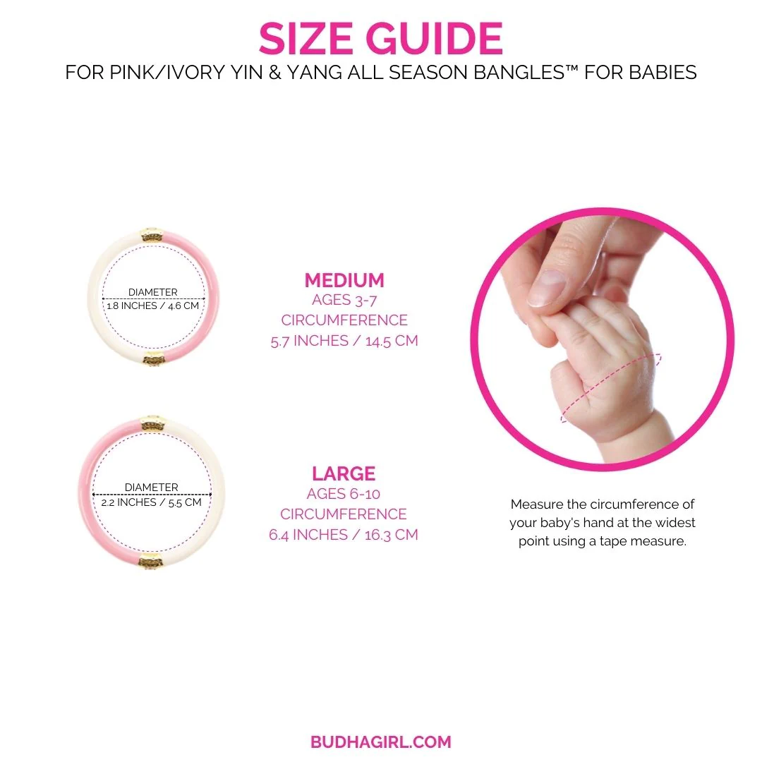 BuDhaGirl's set of two Pink/Ivory Yin & Yang bangles are beautiful orbs that combine bright and light and are joined with our exclusive Universe bead that is gold plated brass and has a clear faceted crystal. Of course, they are waterproof, soundless, weightless, and TSA Proof. BTW…we have adult Yin Yang All Weather Bangles as well.