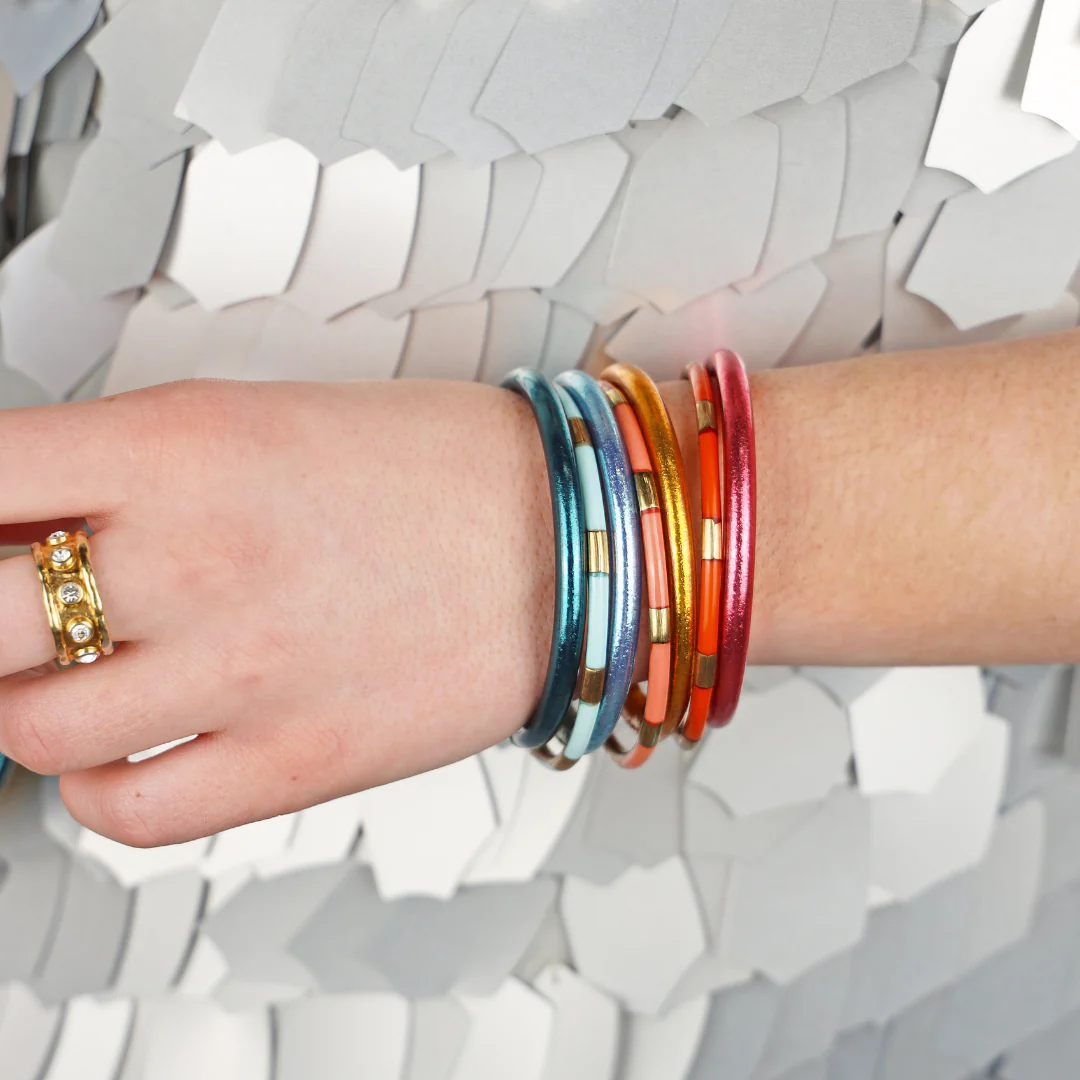 Channel the electric pulse of Puerto Rico with The Bayamon Veda Stack, a vibrant homage to the rhythm and resilience of the Isla del Encanto. This stack captures the heat of the tropics and the cool of the ocean by mixing textures: the smooth, weightless gleam of our All Weather BanglesĀ® and the tactile, organic luxury of Veda bangles. The set features the fiery energy of Burnt Orange and Caramel Vedas, cooled by the refreshing Mint Veda and Azure AWBĀ®. Flashes of Pink and Plume add a playful sunset vibe, while the Spark AWBĀ® ensures you catch the lightāwhether you are dancing in the streets of San Juan or commanding a stage of your own.